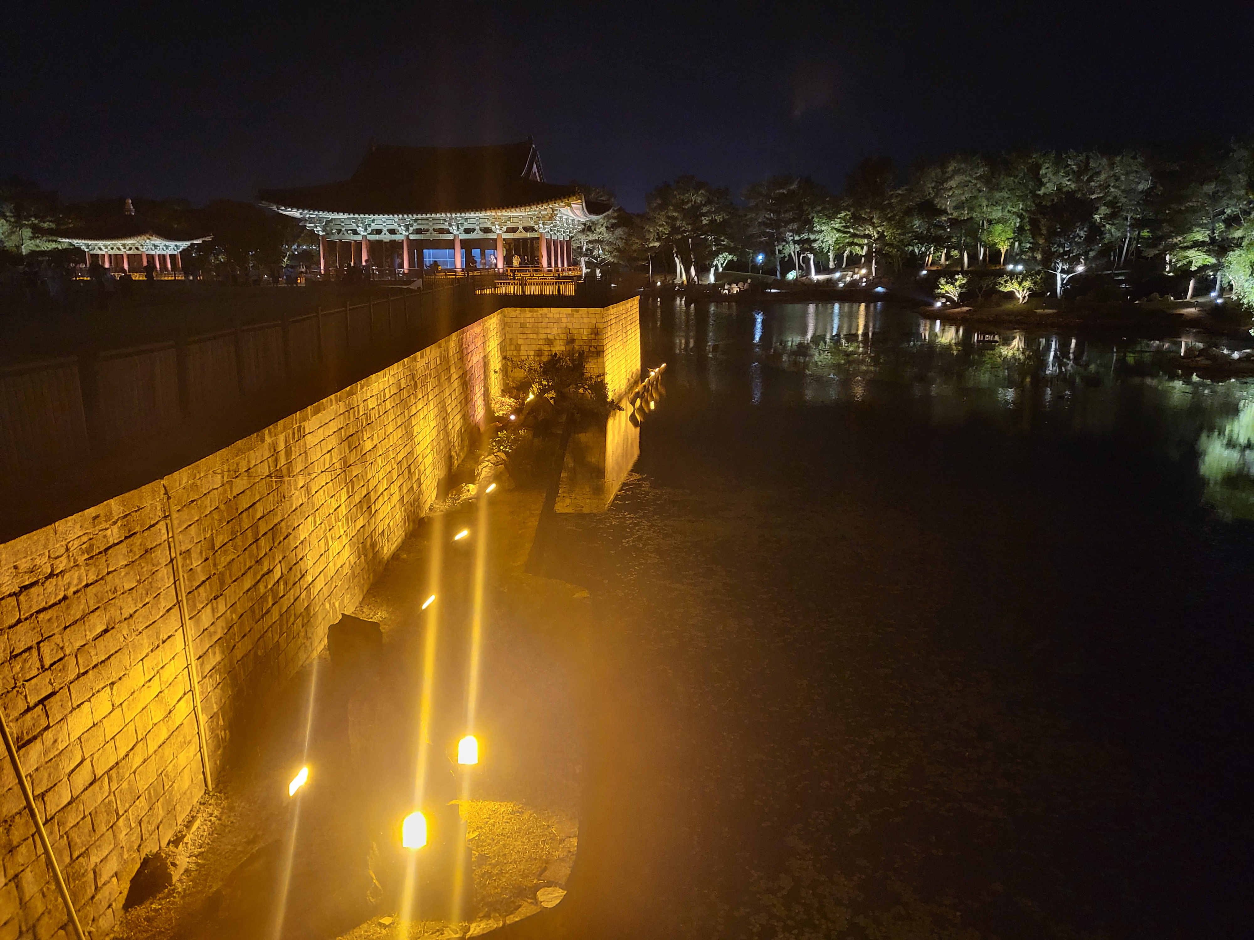 노란 조명이 임해전지 건물과 돌담,