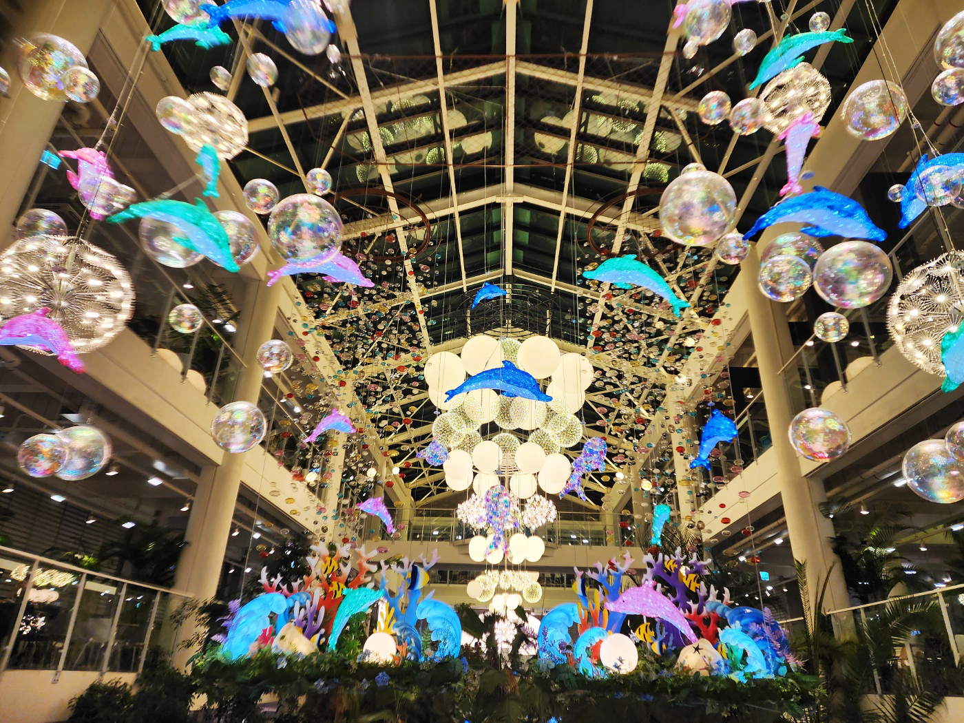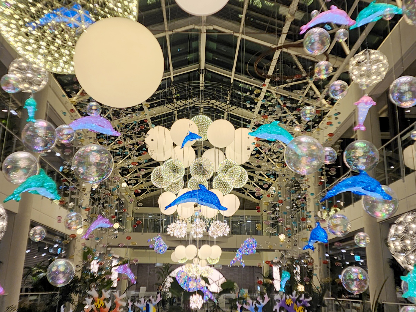천장에 매달린 구형 조명과 LED로 반짝이는 돌고래 장식들 🐬,